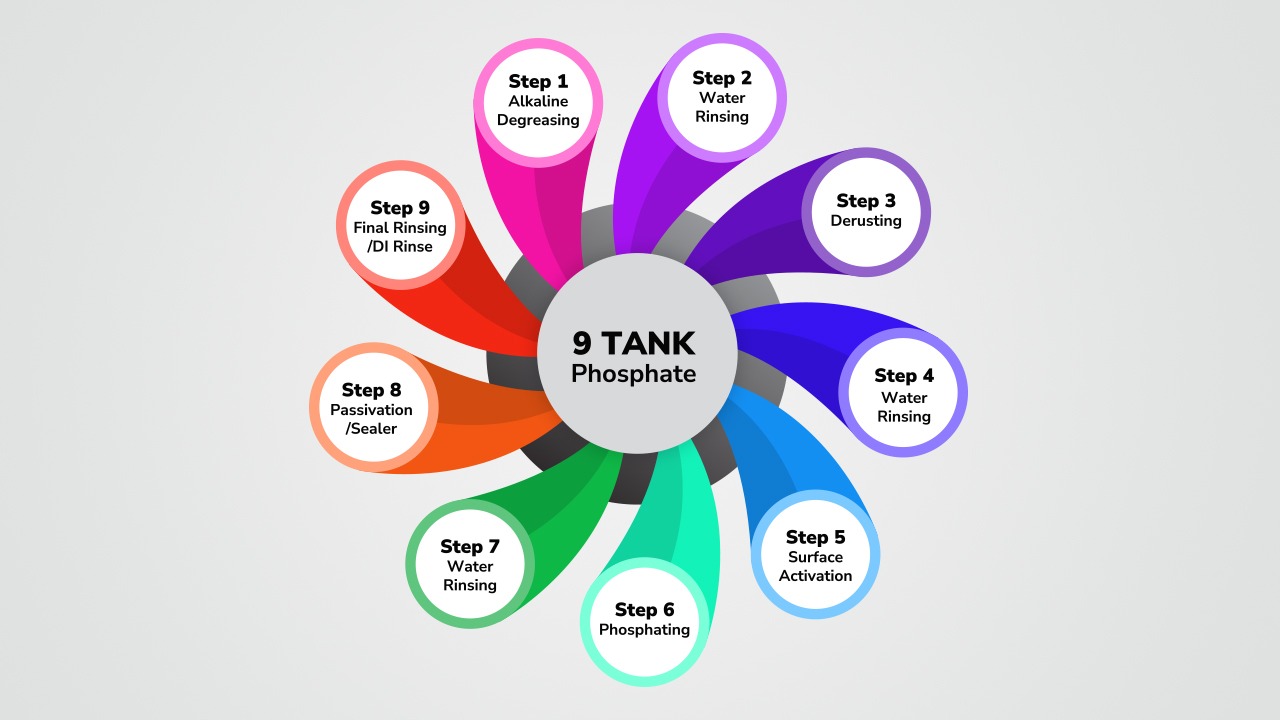 Our 9 Tank Process offers a detailed and extended pretreatment system for surfaces that require the highest level of cleaning and preparation. It includes additional rinsing and conditioning stages that help remove residues more effectively and improve coating adhesion. With enhanced cleaning support and controlled performance, our 9 Tank Process helps industries achieve superior surface cleanliness and consistent finishing results in demanding applications.